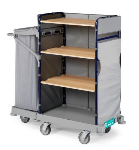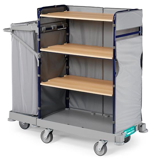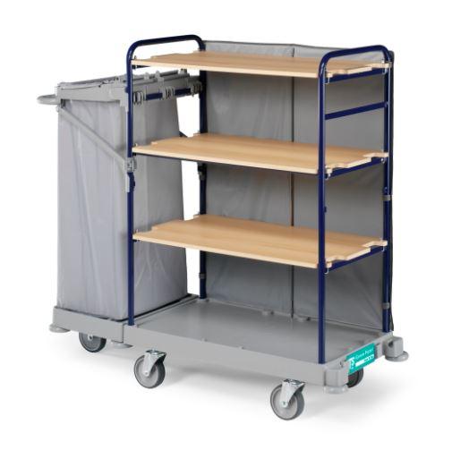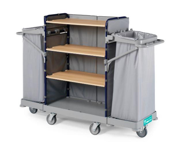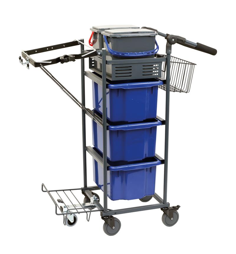 Kahe 200 mm diam rattaga hoolduskäru, mis on varustatud teisaldatava kandiku, mitmeotstarbeliste taskute, konksu ja teiprihmaga tööriistade ja teisaldatavate vaheseinte kinnitamiseks. Soovitatav 2 ruumi hooldamiseks. Mõõdud: 67x47x108 cm
