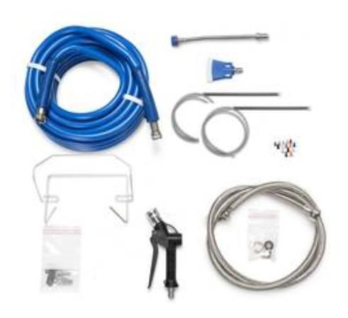 Lisatarvikute komplekt sisaldab: 15 meetrine Food Grade voolik liitmikega, vahupüstol liitmikega, tornado loputusdüüs 23cm pikkuse varrega, Topjet vahudüüs, kemikaali imuvoolik (sinine), kemikaali imuvoolik (kollane), 2 x doseerimisdüüside komplekt, 1,5 m pikkune toiteevee voolik, roostevabast terasest voolikuhoidja