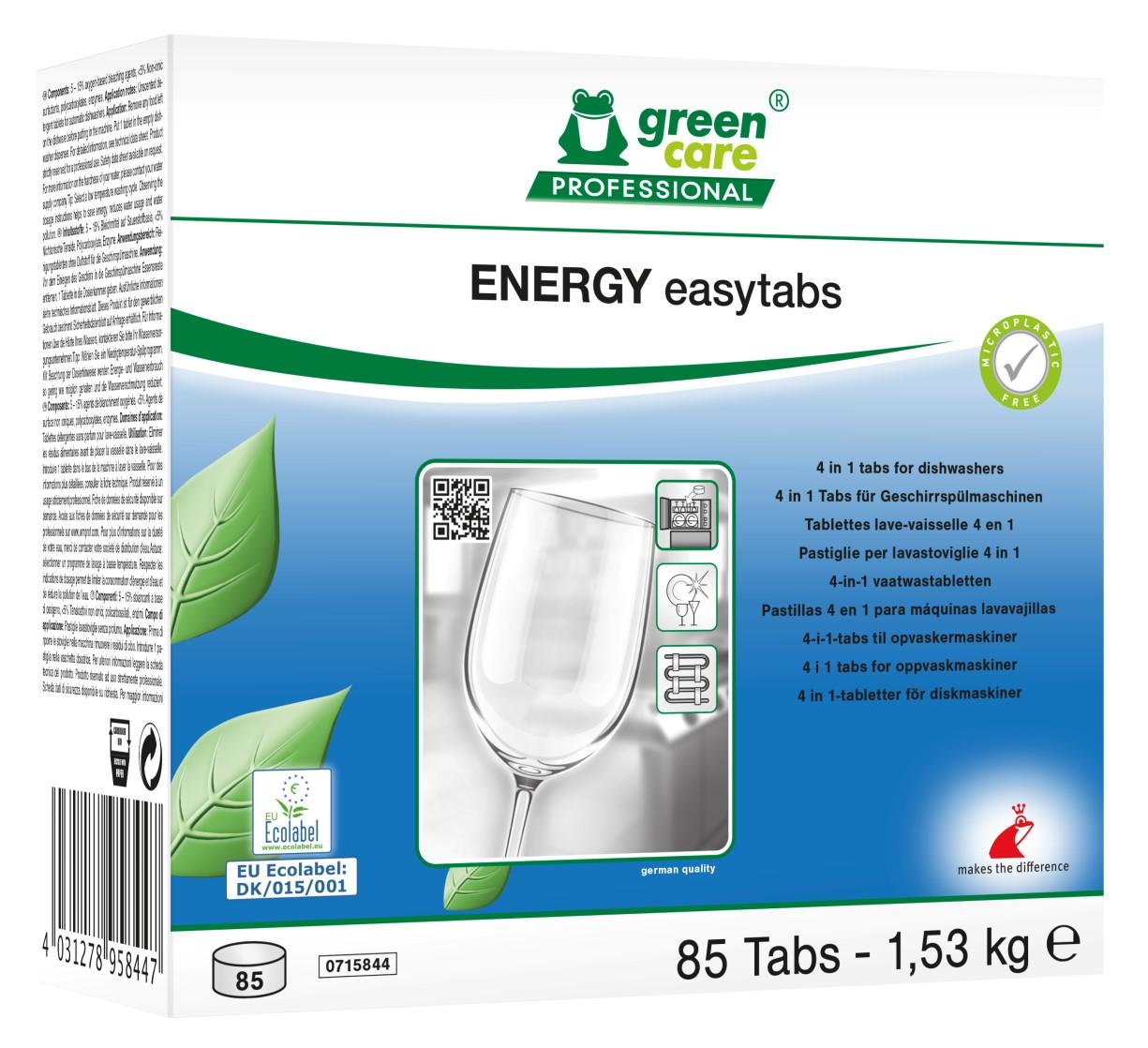 Nõudepesutablettide ENERGY easytabs puhul on neli olulist omadust koondatud ühte tabletti. * Pesuvahend: eemaldab plekid ja rasva ning tagab nõude PUHTUSE. * Loputusvahend: kiirendab kuivamist, ei lase katlakivijääkidel tekkida ja annab nõudele SÄRA. * Regenereerimine: hoiab ära valge katu tekke ja nõud on LÄIKIVAD. * Kaitse: kaitseb teie nõusid, andes neile pikema KASUTUSEA. Toode ei sisalda fosfaate ega lõhnaaineid. Toode ei lase katlakivil kütteelementidele koguneda. Peamiselt taastuvatest ressurssidest valmistatud ENERGY easytabs tunnistab oma vastutust tulevaste generatsioonide ees. Sobib kasutamiseks kõikides automaatsetes poolprofi ja kodus kasutatavates nõudepesumasinates. Kastis: 5 tk